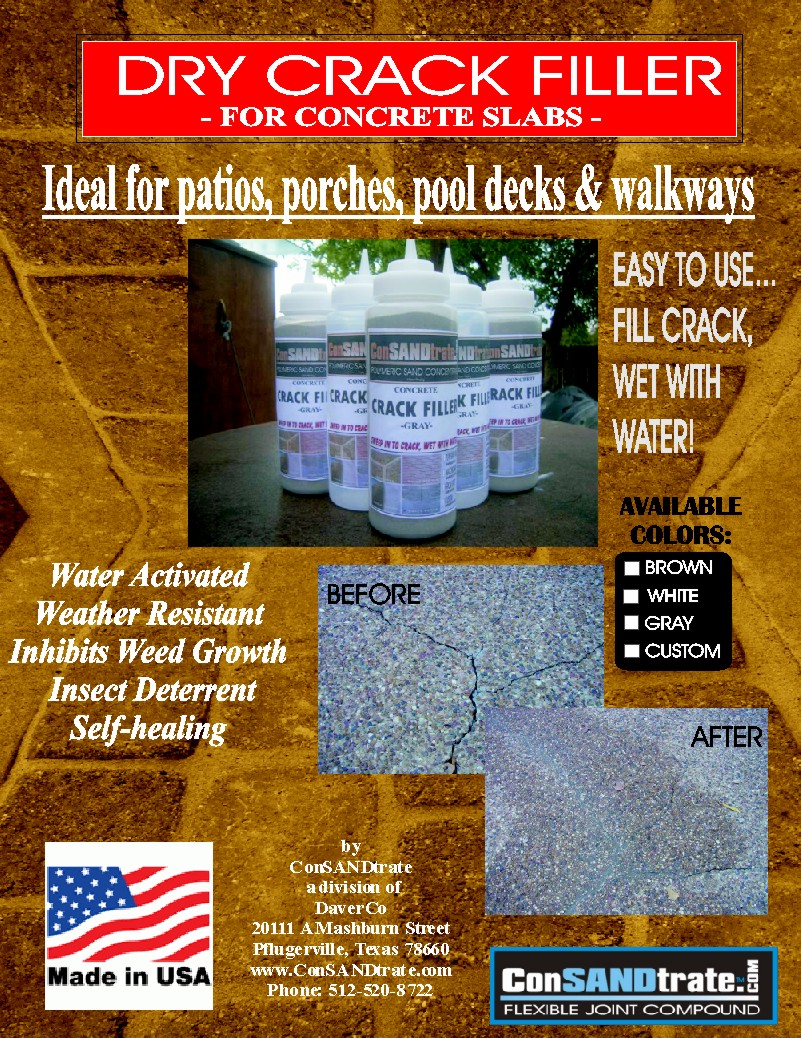 Filling in cracks and missing grout in your patio, walkway or pool deck just got easier! With ConSANDtrate Dry Crack Filler (DCF) its easy and inexpensive to make your concrete look brand new again! Now available in over 25 colors including natural stone colors such as white for popular limestone rock, tan for concrete slabs and brown for exposed aggragate surfaces. We also have many popular colors of DCF to match your specific stained concrete.